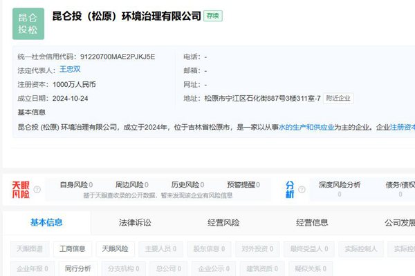 近日,昆仑投(松原)环境治理有限公司成立,法定代表人为王忠双,注册资本为1000万元,经营范围包含: 【一般项目】污水处理及其再生利用;水环境污染防治服务;市政设施管理;环境保护监测;环保咨询服务;农村生活垃圾经营性服务;水利相关咨询服务;水资源管理;工程管理服务;城市绿化管理;物联网应用服务;信息技术咨询服务;水污染治理;办公设备...