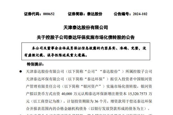 近日,天津泰达股份有限公司(简称:泰达股份)公告称,公司所属控股子公司天津泰达环保有限公司(以下简称“泰达环保”)拟引入投资者中国银河资产管理有限责任公司(以下简称“银河资产”)实施市场化债转股,银河资产拟以货币方式出资 40,000 万元认购泰达环保新增注册资本 15,320.7573...