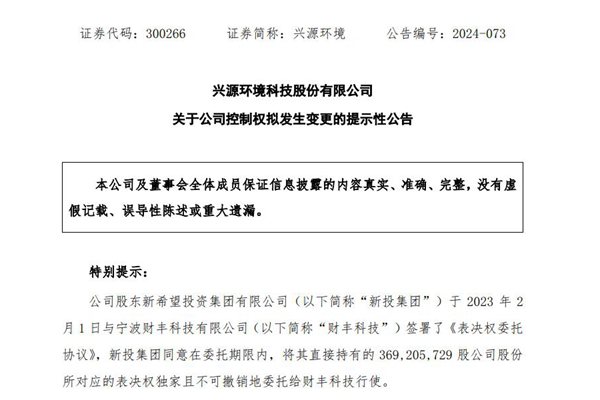 兴源环境科技股份有限公司(简称:兴源环境)11月4日晚发布《关于公司控制权拟发生变更的提示性公告》。公告显示,兴源环境控股股东将变更为锦奉科技,实际控制人将变更为宁波市奉化区国有资产管理中心。 据悉,11月1日,兴源环境股东新希望投资集团有限公司(以下简称“新投集团”)与宁波锦奉智能科技有限公司(以下简称&l...
