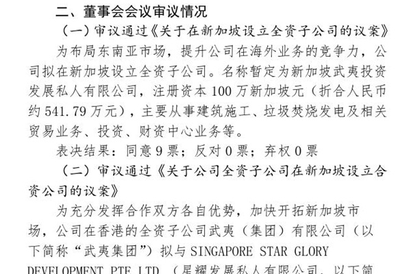 2024年10月22日,中国武夷实业股份有限公司发布《第八届董事会第六次会议决议公告》。图源:中国武夷实业股份有限公司 公告明确,董事会已审议通过《关于在新加坡设立全资子公司的议案》。中国武夷拟在新加坡设立全资子公司,名称暂定为新加坡武夷投资发展私人有限公司,注册资本100万新加坡元(折合人民币约541.79 万元),主要从事建筑施...