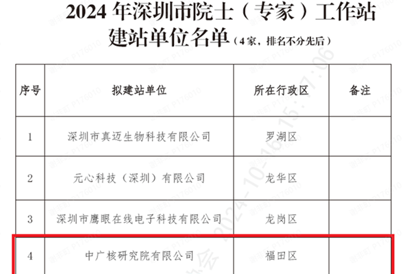 10月16日,深圳市科学技术协会发布《关于批准建立2024年度深圳市院士(专家)工作站的通知》,批准了中广核研究院挂牌建立深圳市院士(专家)工作站。 深圳市院士(专家)工作站是以企业的产业发展和科技创新需求为导向,以院士及企业联合团队为技术支撑,以提高企业科技创新能力和核心竞争力为目的,而成立的科技创新平台。早在2021年,中广核研...