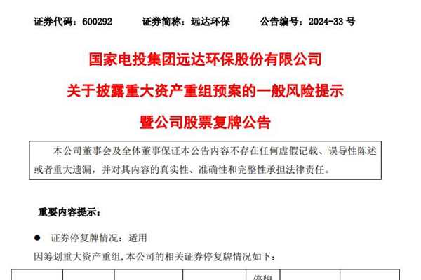 国家电投集团远达环保股份有限公司(简称:远达环保)近日公告称,经向上海证券交易所申请,公司股票将于2024 年 10 月 21 日(星期一)开市起复牌。图源:远达环保公告 申明:本站发布此信息的目的在于传播更多信息,与本站立场无关。并且郑重提示所有阅读者,股市有风险,投资需谨慎,本文不作为任何投资的参考意见和依凭。 原标题:远达环...