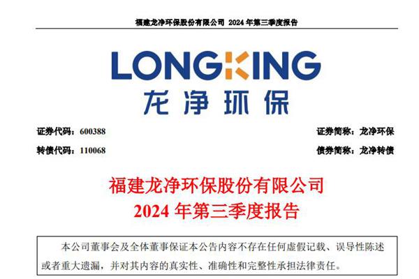 福建龙净环保股份有限公司(简称:龙净环保)近日发布《2024 年第三季度报告》,2024 年前三季度实现营业收入 66.54 亿元,实现归属于母公司所有者的净利润 6.47 亿元,比上年同期增长 0.91%;实现扣非后归属于母公司所有者的净利润 5.85 亿元,比上年同期增长 18.23%。经营活动产生的现金流量净额 11.64 亿元...