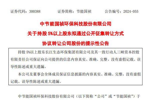 中节能国祯环保科技股份有限公司(简称:节能国祯)10月14日公告称,其持股5%以上股东长江生态环保集团有限公司(下称“长江环保集团”)及其一致行动人三峡资本控股有限责任公司(下称“三峡资本”)决定,将通过公开征集转让方式协议转让所持有的全部节能国祯股份 73,040,457 股,占其总股...