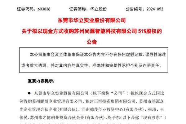东莞市华立实业股份有限公司(简称:华立股份)近日发布公告称,将以现金方式同比例收购苏州鹏博企业管理有限公司、福建正恒投资集团有限公司、苏州市鸿源众尚企业管理合伙企业(有限合伙)、河南德茂创业投资中心(有限合伙)、张琦、王伟民、苏州豫之博创业投资合伙企业(有限合伙)、周予东持有的苏州尚源智能科技有限公司(以下简称“尚源智能&...