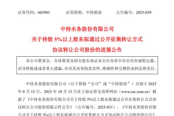 中持水务股份有限公司(简称:中持股份)10月26日公告称,公司已收到长江生态环保集团有限公司(下称“长江环保集团”)函告,本次公开征集期内,共有一家意向受让方江苏芯长征微电子集团股份有限公司提交了受让申请材料。长江环保集团将按照《上市公司国有股权监督管理办法》(国务院国有资产监督管理委员会、财政部、中国证券监督...