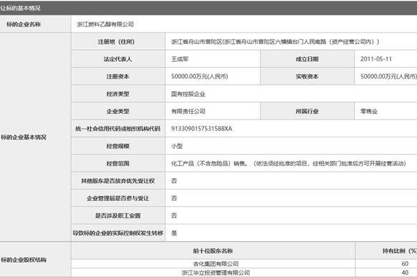 浙江燃料乙醇有限公司60%股权在北京产权交易所挂牌,转让底价25415.00万元,信息披露结束日期2024年8月27日,转让方是吉化集团有限公司。 浙江燃料乙醇有限公司 注册资本50000.00万元(人民币) ,属于国有控股企业,规模小型,吉化集团有限公司持股60%,浙江华立投资管理有限公司持股40%,经营范围: 化工产品(不含...