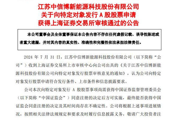 江苏中信博新能源科技股份有限公司发布《关于向特定对象发行A股股票申请获得上海证券交易所审核通过的公告》: 2024 年 7 月 31 日,江苏中信博新能源科技股份有限公司收到上海证券交易所上市审核中心向公司出具的《关于江苏中信博新能 源科技股份有限公司向特定对象发行股票审核意见的通知》,认为公司向特定 对象发行股票申请符合发行条件、...