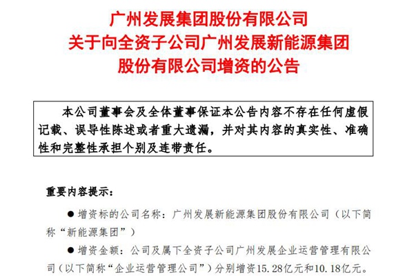 广州发展集团股份有限公司发布《关于向全资子公司广州发展新能源集团股份有限公司增资的公告》—— 增资标的公司名称:广州发展新能源集团股份有限公司 增资金额:公司及属下全资子公司广州发展企业运营管理有限公司分别增资15.28亿元和10.18亿元。 本次增资完成后,新能源集团股本预计将增加至人民币 45 亿元,...