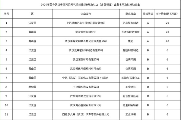 武汉市生态环境局关于重污染天气绩效提级B级及以上(含引领性)企业补助资金的公示 为进一步推动我市重点行业企业提升重污染天气绩效等级,充分发挥生态环境保护专项资金的引导和激励作用,根据《武汉市B级及以上(含引领性)绩效提级企业补助办法(试行)》相关要求,现对2020年至今湖北省生态环境厅公布的我市56家B级及以上(含引领性)绩效提级企...