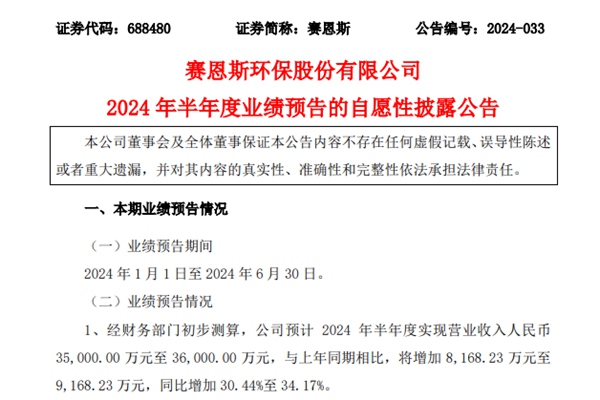 2024年1月初至6月底,经赛恩斯环保股份有限公司财务部门初步预算,公司预计 2024 年半年度实现营业收入人民币35,000.00 万元至 36,000.00 万元,与上年同期相比,将增加 8,168.23 万元至9,168.23 万元,同比增加 30.44%至 34.17%。预计 2024 年半年度实现归属于母公司所有者的净利润人...