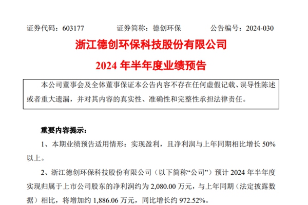 浙江德创环保科技股份有限公司(以下简称“公司”)预计 2024 年半年度实现归属于上市公司股东的净利润约为 2,080.00 万元,与上年同期(法定披露数据)相比,将增加约 1,886.06 万元,同比增长约 972.52%。 公司预计 2024 年半年度实现归属于上市公司股东的扣除非经常性损益的净利润约为 ...