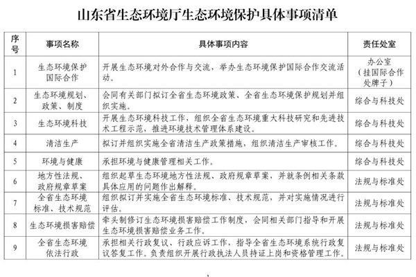 山东省生态环境厅生态环境保护具体事项清单 按照《关于印发〈山东省贯彻落实《关于推动职能部门做好生态环境保护工作的意见》的若干措施〉的通知》(鲁环委〔2023〕2号)要求,省生态环境厅依据部门“三定”规定、生态环境保护责任清单等有关文件,制定了《山东省生态环境厅生态环境保护具体事项清单》,现予以公开。 附件:山东...