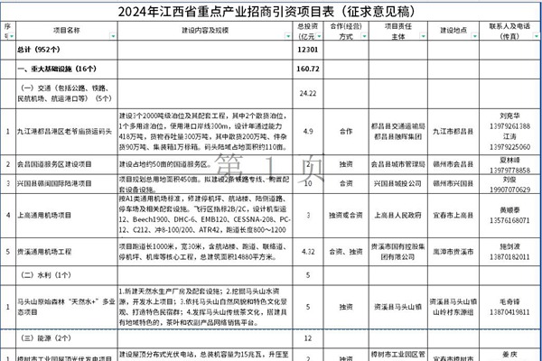 江西省发展改革委会同省商务厅、省工信厅编制了《2024年江西省重点产业招商引资项目册》,明确了2024年对外招商引资的重要方向:包括节能环保、新能源、新材料等,共推出952个招商项目,总投资1.23万亿元。 涉环保项目:樟树市工业园屋顶光伏发电项目,高安电网侧独立储能电站项目,铜鼓县乡镇污水管网及配套设施建设项目,弋阳县生活垃圾分类...