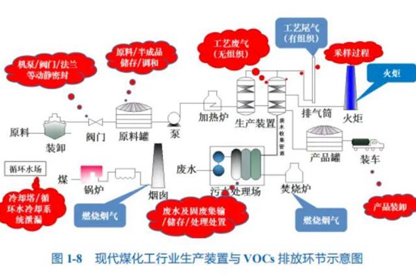 现代煤化工行业生产工艺与VOCs排放环节示意、现代煤化工行业生产装置与VOCs排放环节示意见图1-7、图1-8。 01 源头削减 (1)原料性质稳定性 ●原料煤性质定期检测,宜设置配煤环节,保证原料煤性质稳定。 (2)生产工艺 ●采用全密闭、连续化、自动化等生产技术,以及高效工艺与设备装置。 (3)装置 ●采样口应采用...