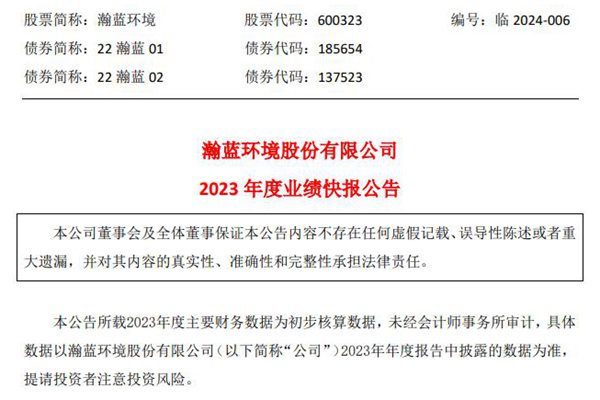 4月1日,瀚蓝环境股份有限公司(简称:瀚蓝环境)发布《2023年度业绩快报公告》。公告显示,瀚蓝环境2023年营业总收入约125.41亿元,同比减少2.59%;归属于上市公司股东的净利润约14.3亿元,同比增加25.23%;基本每股收益1.75元,同比增加25%。 瀚蓝环境分析称,2023年公司营业收入同比下降而净利润同比增加的主要...