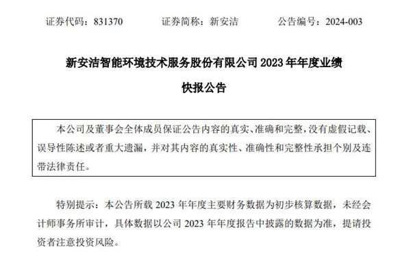 新安洁智能环境技术服务股份有限公司(简称:新安洁)近日发布《2023年年度业绩快报公告》,全年实现营业收入581,852,027.38元,同比下降3.16%;归属于上市公司股东的净利润亏损50,431,132.43元,与上年同期亏损53,011,052.40元相较,同比减亏4.87%;基本每股收益亏损0.16元,同比增长4.87%。截...