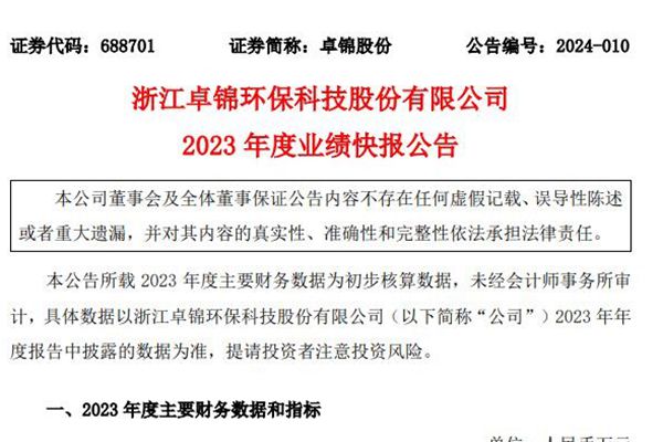 浙江卓锦环保科技股份有限公司(简称:卓锦股份)近日发布《2023 年度业绩快报》,公告营收及利润情况。报告显示,卓锦股份2023年共实现营业收入34838.46万元,较2022年同期的24582.69万元增长41.72%;归属于母公司所有者的净利 润同比减少26.78%,亏损11898.62万元,上年同期亏损9385.36万元;本报告...