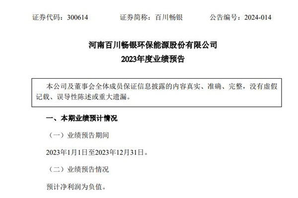 河南百川畅银环保能源股份有限公司(简称:百川畅银)近日发布《2023年度业绩预告》,预计归属上市公司股东的净利润亏损5000万元-7000万元,上年同期盈利3768.39万元;扣除非经常性损益后的净利润亏损4750万元-6750万元,上年同期盈利5713.49万元。 百川畅银认为,公司业绩变动主要受六方面因素影响,包括补贴收入确认减...