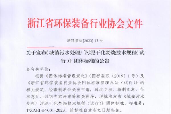 2023年12月1日,浙江省环保装备行业协会发布了《城镇污水处理厂污泥干化焚烧技术规程(试行)》团体标准,该标准自发布之日起实施。...
