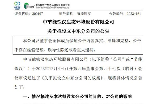 近日,中节能铁汉发布公告表示,中节能铁汉生态环境股份有限公司于2023年12月4日召开第四届董事会第四十七次(临时)会议审议通过了《关于拟设立中东分公司的议案》。 中节能铁汉表示,基于我国“一带一路”战略与迪拜“向东看”战略发展上高度一致,我国与迪拜在经贸领域拥有广阔的发展前景。公司在...