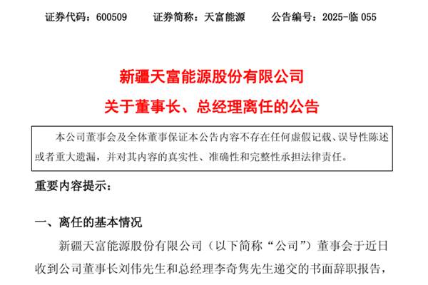新疆天富能源股份有限公司(简称:天富能源)公告称,公司董事会于近日收到公司董事长刘伟先生和总经理李奇隽先生递交的书面辞职报告,因工作调整,刘伟先生申请辞去公司董事长及董事会战略委员会召集人、投资决策委员会主任、提名委员会委员、薪酬与考核委员会委员等一切职务,辞职后将不再担任公司任何职务;李奇隽先生申请辞去公司总经理职务,辞职后将不再担...