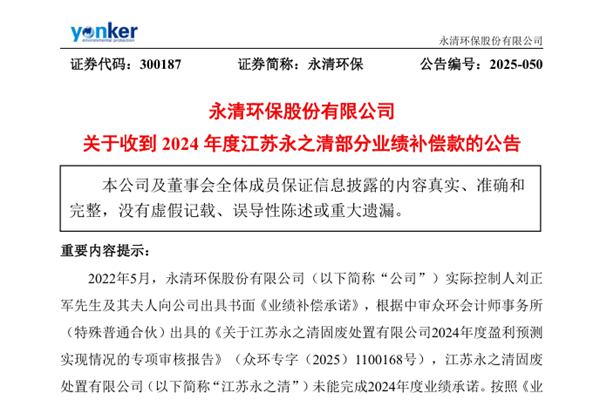 永清环保股份有限公司(简称:永清环保)近日公告称,截至目前,公司已收到实际控制人、控股股东湖南永清环境科技产业集团有限公司(下称“永清集团”)的业绩补偿款6,000,000元,本次业绩承诺补偿义务尚未履行完毕。 据悉,2022年5月,永清环保实际控制人刘正军先生及其夫人向公司出具书面《业绩补偿承诺》,根据中审...