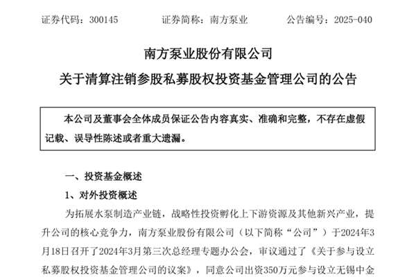 南方泵业股份有限公司(简称:南方泵业)近日公告称,目前私募股权投资行业正经历深刻变更,行业正处于结构性调整与复苏并存的阶段,无锡一石私募基金管理有限公司(下称“无锡一石”)成立后未开展实际经营活动。为进一步优化资源配置,提高运营效率,经无锡一石股东协商一致,拟进行清算注销。 据悉,今年9月份,为拓展水泵制造产...