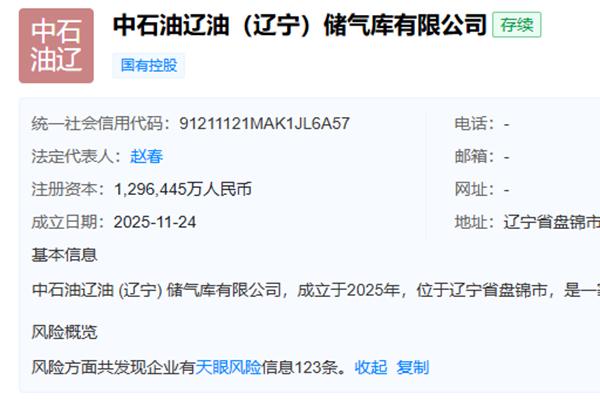 据天眼查,11月24日,中石油辽油(辽宁)储气库有限公司正式成立,注册资本为1296445万人民币,经营范围如下↓ 许可项目:建设工程施工。(依法须经批准的项目,经相关部门批准后方可开展经营活动,具体经营项目以相关部门批准文件或许可证件为准)一般项目:仓储设备租赁服务;工程管理服务;机械设备租赁;技术服务、技术开发、技术咨...
