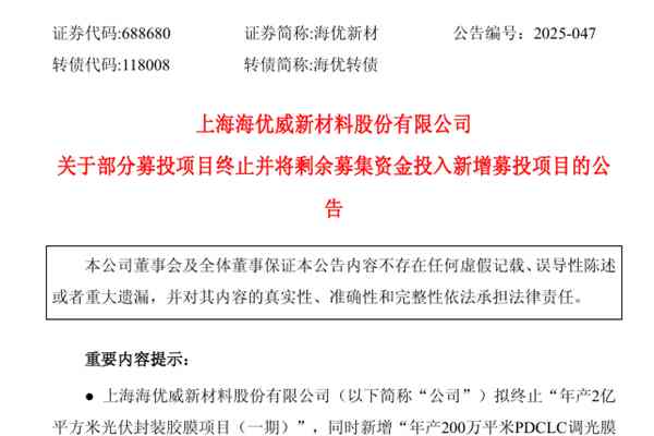 全球光伏装机同比增速放缓的影响仍在持续。 近日,上海海优威新材料股份有限公司(简称:海优新材)发布公告,宣布终止“年产2亿平方米光伏封装胶膜项目(一期)”,并将该项目剩余募集资金22,602.78万元投入新项目“年产200万平米PDCLC调光膜产品建设项目(一期)”。 据悉,新项目总...