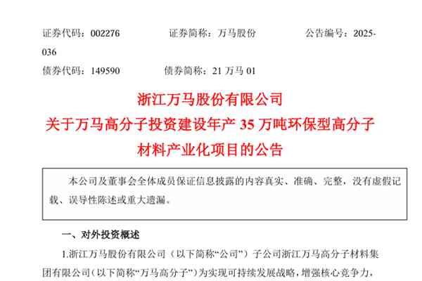 浙江万马股份有限公司(简称:万马股份)近日公告称,子公司浙江万马高分子材料集团有限公司(下称“万马高分子”)为实现可持续发展战略,增强核心竞争力,拟在山东省青岛市董家口经济区建设“年产 35 万吨环保型高分子材料产业化项目”。预计项目总投资约12.45亿元(最终以实际投资情况为准),项目...