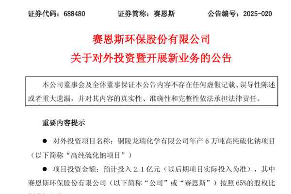 7月21日晚间,赛恩斯环保股份有限公司(简称:赛恩斯)发布关于对外投资暨开展新业务的公告,宣布将与铜陵瑞嘉特种材料有限公司合作,设立控股子公司铜陵龙瑞化学有限公司(下称“龙瑞化学”),建设年产6万吨高纯硫化钠项目,预计总投资2.1亿元,其中赛恩斯按照65%的股权比例进行出资。图源:赛恩斯公告 据介绍,硫化钠是...