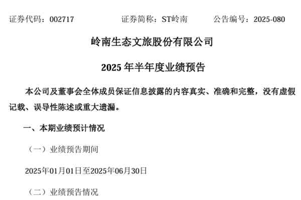 岭南生态文旅股份有限公司(简称:ST岭南)近日发布《2025年半年度业绩预告》。报告期内,ST岭南预计实现归属于上市公司股东的净利润亏损13,000万元–19,500万元,上年同期亏损25,945.51万元;扣除非经常性损益后的净利润亏损13,010万元–19,510万元,上年同期亏损25,769.47万元;基...