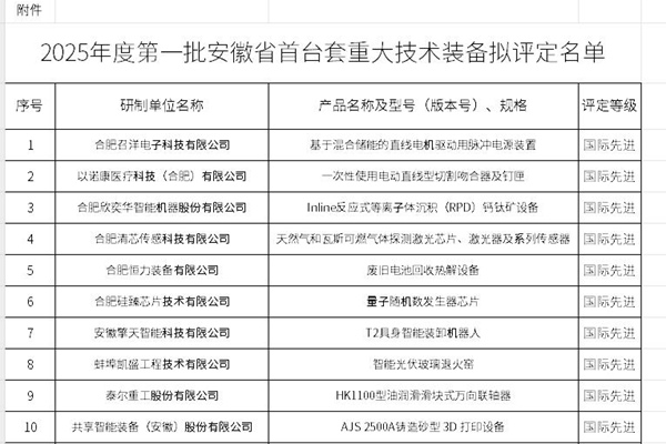 2025年度第一批安徽省首台套重大技术装备拟评定名单公示,包括基于混合储能的直线电机驱动用脉冲电源装置;废旧电池回收热解设备;智能光伏玻璃退火窑;再生塑料工业色选机;光伏铝边框生产智能自动化物流系统;新能源重卡底盘换电站;移动式温室气体监测系统;200T/D隔油调蓄型污水处理装备;重点区域多组分气体追因溯源监测系统装备;DL120/7...