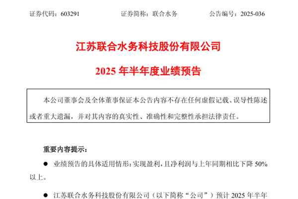 江苏联合水务科技股份有限公司(简称:联合水务)近日发布《2025年半年度业绩预告》。报告期内,联合水务预计实现归属于上市公司股东的净利润3,894.78万元左右,与上年同期相比减少约53.11%;归属于上市公司股东的扣除非经常性损益的净利润3,463.04 万元左右,与上年同期相比减少约29.70%。 联合水务表示,报告期内,公司业...