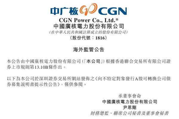 2025年07月06日,中国广核电力股份有限公司发布《海外监管公告 - 向不特定对象发行A股可转换公司债券募集说明书提示性公告》。图源:中广核电力公告 (一)发行证券的种类 本次发行证券的种类为可转换为公司 A股股票的可转换公司债券。该等 A股可转换公司债券及未来转换的A股股票将在深圳证券交易所主板上市。 (二)发行规模 本次...