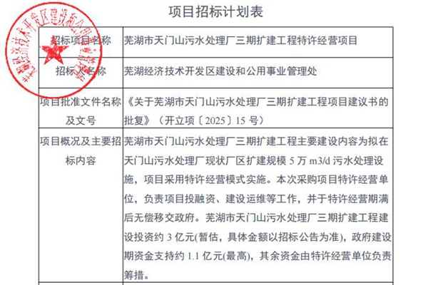 安徽芜湖市天门山污水处理厂三期扩建工程特许经营项目招标计划发布。 项目概况: 芜湖市天门山污水处理厂三期扩建工程主要建设内容为拟在天门山污水处理厂现状厂区扩建规模5万m3/d污水处理设施,项目采用特许经营模式实施。本次采购项目特许经营单位,负责项目投融资、建设运维等工作,并于特许经营期满后无偿移交政府。芜湖市天门山污水处理厂三期扩...
