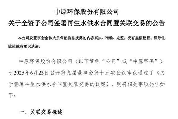 2025年06月25日,中原环保股份有限公司发布《关于全资子公司签署再生水供水合同暨关联交易的公告》。图源:中原环保公告 郑州市污水净化有限公司拟与郑州水务集团有限公司签订再生水供水合同,由净化公司向水务集团销售部分再生水,价格0.83 元/吨,每日供应量不超过30万吨。 郑州水务集团有限公司为中原环保控股股东全资子公司,本次交易...