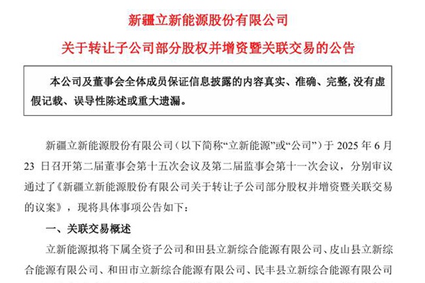 2025年06月25日,新疆立新能源股份有限公司发布《关于转让子公司部分股权并增资暨关联交易的公告》。图源:立新能源公告 立新能源拟将下属全资子公司和田县立新综合能源有限公司、皮山县立新综合能源有限公司、和田市立新综合能源有限公司、民丰县立新综合能源有限公司各49%股权转让给公司控股股东新疆能源(集团)有限责任公司全资子公司新疆能源...