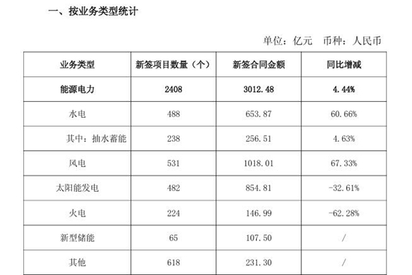 2025年06月21日,中国电力建设股份有限公司发布《2025 年 1 月至 5 月主要经营情况公告》。图源:中国电建公告 风电新签项目531个,合同金额1018.01亿元,同比增长 67.33%;太阳能发电新签项目482个,合同金额854.81亿元,同比减少32.61%;新型储能新签项目65个,合同金额 107.5亿元。另外,水资...
