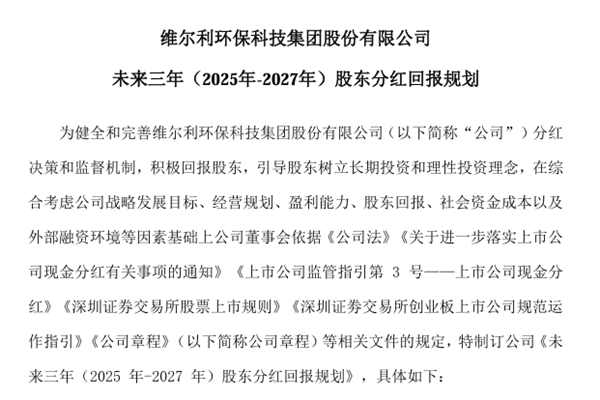 维尔利环保科技集团股份有限公司(简称:维尔利)近日披露《未来三年(2025年-2027年)股东分红回报规划》: 1、公司利润分配应重视对投资者的合理投资回报,可以采取现金方式、股票方式或者现金与股票相结合的方式分配股利,现金分红方式优先于股票股利的分配方式,公司董事会可以根据公司的经营状况提议公司进行中期现金分配。 2、公司根据《...