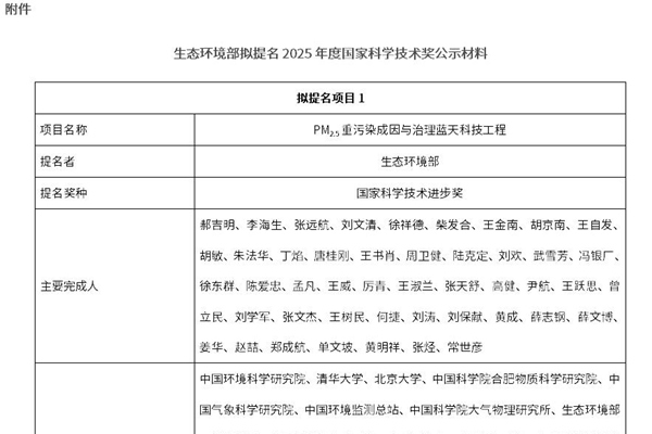 关于拟提名2025年度国家科学技术奖的公示 根据《国家科学技术奖励工作办公室关于2025年度国家科学技术奖提名工作的通知》的有关要求,现将我部拟提名2025年度国家科学技术奖予以公示。自公示之日起5日内,任何单位和个人对公示内容持有异议,均可在公示期内通过书面或电话实名提出。 联系地址:北京市东长安街12号生态环境部科技与财务司(邮编...