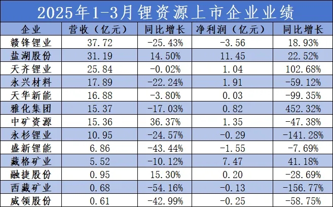 近日,13家锂盐上市企业发布2025年第一季度报告,广东省电池行业协会对13家锂盐企业发布的业绩数据进行了梳理统计。 从营收来看,13家企业的营收总额达到185.81亿元,营收平均数为14.29亿元,排在第七名的中矿资源之后。 赣锋锂业以37.72亿元位居第一,盐湖股份也突破30亿元,达到31.19亿元,位列第二,天齐锂业以25....