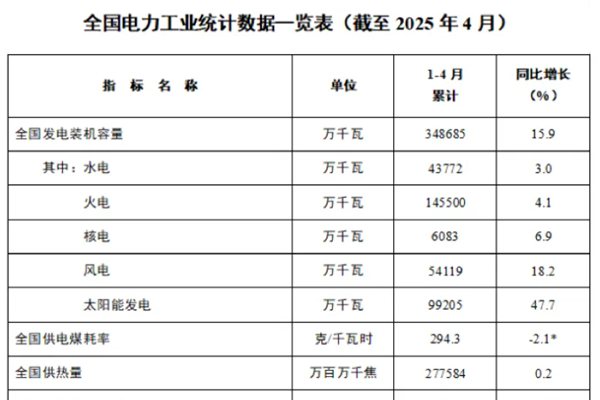 5月22日,国家能源局发布1-4月份全国电力工业统计数据。 截至4月底,全国累计发电装机容量34.9亿千瓦,同比增长15.9%。其中,太阳能发电装机容量9.9亿千瓦,同比增长47.7%;风电装机容量5.4亿千瓦,同比增长18.2%。 1-4月份,全国发电设备累计平均利用1008小时,比上年同期降低103小时;全国主要发电企业电源工...