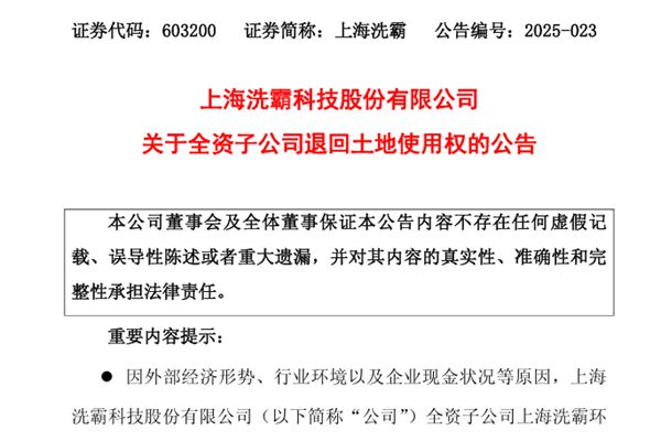 5月9日晚间,上海洗霸科技股份有限公(简称:上海洗霸)公告称,因外部经济形势、行业环境以及企业现金状况等原因,全资子公司上海洗霸环保科技有限公司拟申请退回上海市嘉定区嘉定新城F01C-01地块土地使用权,预计减少利润总额约3642万元,同时收回土地出让金1.02亿元。图源:上海洗霸公告 据悉,2020年,为满足公司业务发展对经营、研...