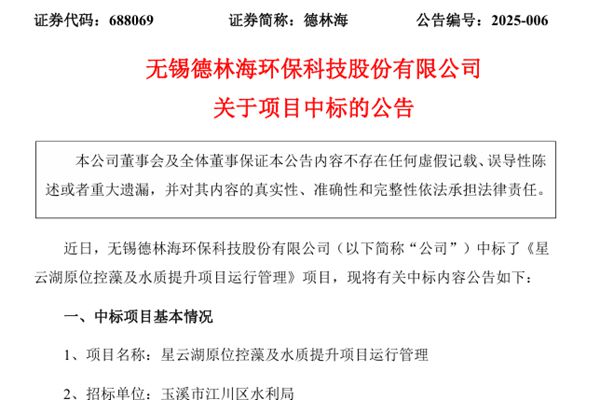 无锡德林海环保科技股份有限公司(简称:德林海)近日发布《关于项目中标的公告》。据悉,德林海成功中标了星云湖原位控藻及水质提升项目运行管理项目,预算金额约5,600万元/年,服务期限自合同签订之日起计二年。 中标项目基本情况 1、项目名称:星云湖原位控藻及水质提升项目运行管理 2、招标单位:玉溪市江川区水利局 3、中标金额:本项...