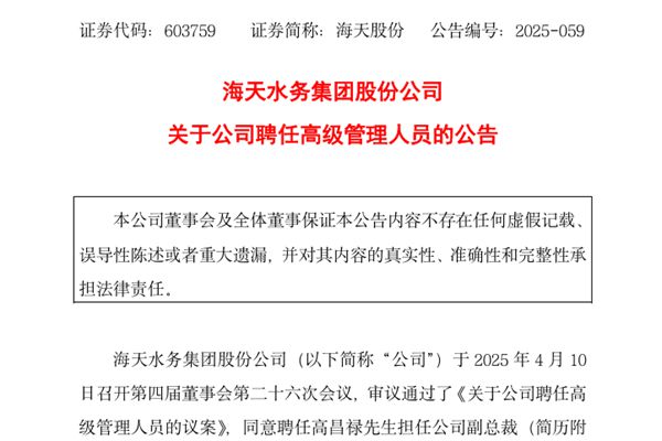 海天水务集团股份公司(简称:海天股份)近日公告称,公司同意聘任高昌禄先生担任公司副总裁。 截至目前,高昌禄先生未持有海天股份股份,与公司控股股东、实际控制人、公司董事、监事、高级管理人员及持股5%以上的股东不存在关联关系,未曾受到中国证券监督管理委员会及其他有关部门的处罚和证券交易所任何惩戒,不属于失信被执行人,不存在《公司法》《上...