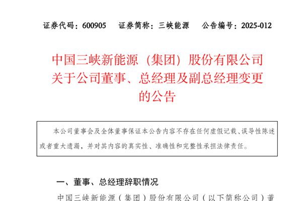 中国三峡新能源(集团)股份有限公司(简称:三峡能源)近日公告称,公司董事会于2025年4月7日收到到公司董事、总经理张龙先生的书面辞职报告。由于工作调动,张龙先生辞去公司总经理、董事及董事会战略与可持续发展委员会委员职务。辞职后,张龙先生不再担任公司及下属子公司的任何职务。 紧接着,三峡能源于2025年4月8日召开第二届董事会第三十...