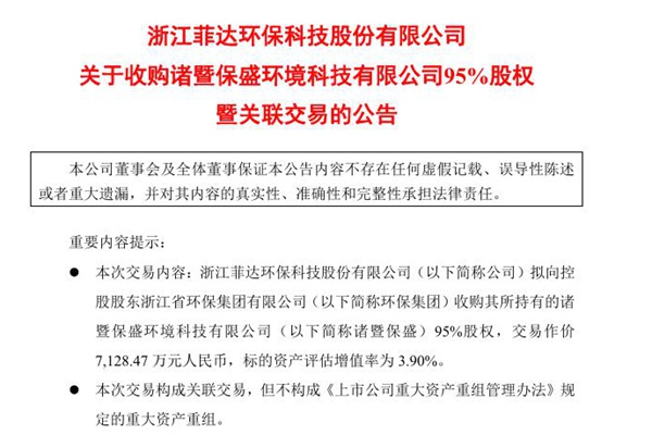 2025年03月20日,浙江菲达环保科技股份有限公司发布《关于收购诸暨保盛环境科技有限公司95%股权 暨关联交易的公告》。图源:菲达环保公告 浙江菲达环保科技股份有限公司拟向控股股东浙江省环保集团有限公司收购其所持有的诸暨保盛环境科技有限公司95%股权,交易作价7,128.47 万元人民币,标的资产评估增值率为3.90%。 本次交...