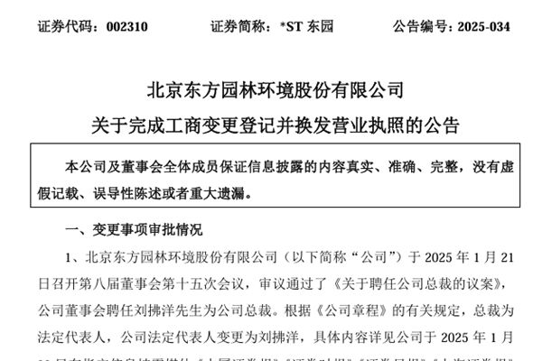 北京东方园林环境股份有限公司(简称:*ST东园,下称“东方园林”)3月20日公告称,公司已完成了工商变更登记手续,并取得了北京市朝阳区市场监督管理局换发的《营业执照》。其中,公司法定代表人变更为刘拂洋,注册资本增至5,999,322,117元。图源:*ST东园公告 申明:本站发布此信息的目的在于传播更多信息,...